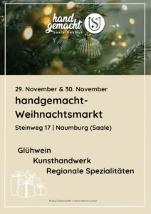 Am 29.11. und 30.11. sind wir bei Advent in den Höfen in Naumburg. Das Café in Boblas ist an diesem Wochenende geschlossen. Ihr findet uns im Steinweg 17 in der Scheune. Wir freuen uns auf Besuch am Stand. Es gibt Kuchen, Kaffee und Pizza.