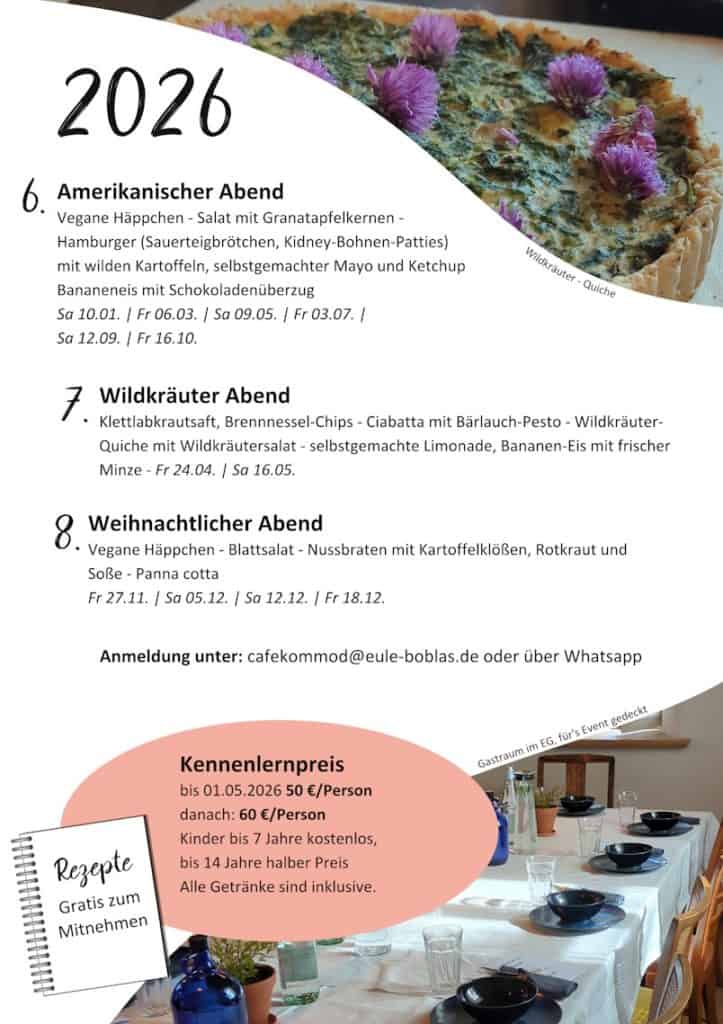 Jeden Freitag oder Samstag um 18 Uhr starten wir mit einem veganen Event zu einem bestimmten Thema. Alle sitzen gemeinsam um einen Tisch und werden von Berni bekocht. Die Rezepte gibt’s zum Mitnehmen.